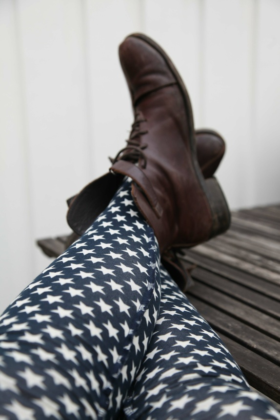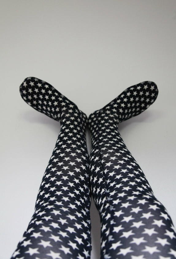 Lange, deilige knestrømper som rekker godt over knærne. De er sydd i mørk blå bomullsjersey med stjerner i skinnende hvitt. Knestrømpene er fasongsydd med en dekorativ overlocksøm på utsiden og i avslutningskanten oppe. De finnes i 2 størrelser: 36-38 og 39-41.