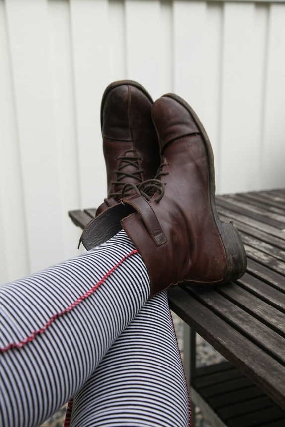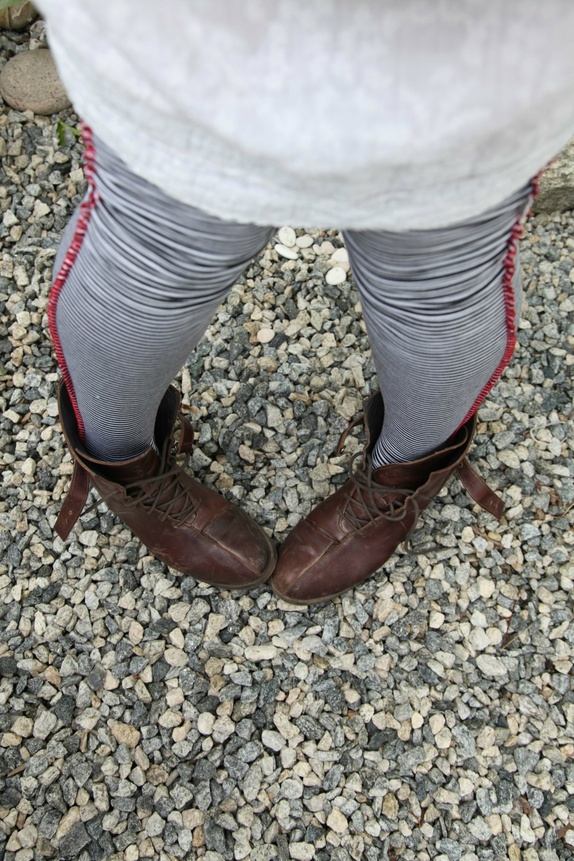 Lange, deilige knestrømper som rekker godt over knærne. De er sydd i sort og hvitt, smalstripete bomullsjersey. Knestrømpene er fasongsydd med en dekorativ rød overlocksøm på utsiden. De finnes i 2 størrelser: 36-38 og 39-41.