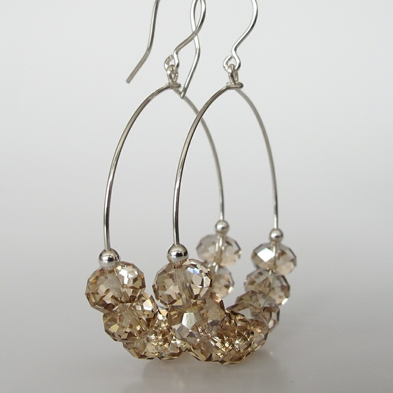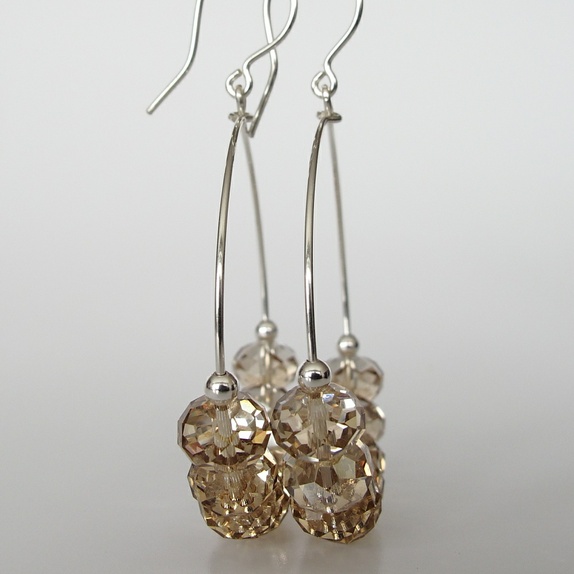 Glitrende øreringer i sølv, med krystaller i en lys, gullskimrende farge.