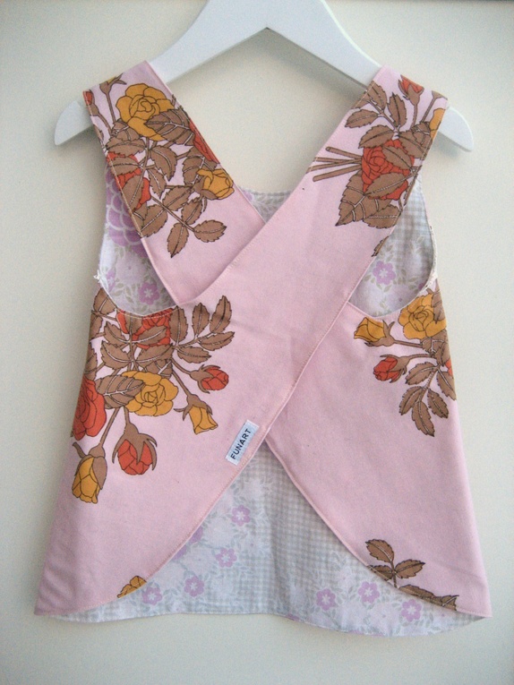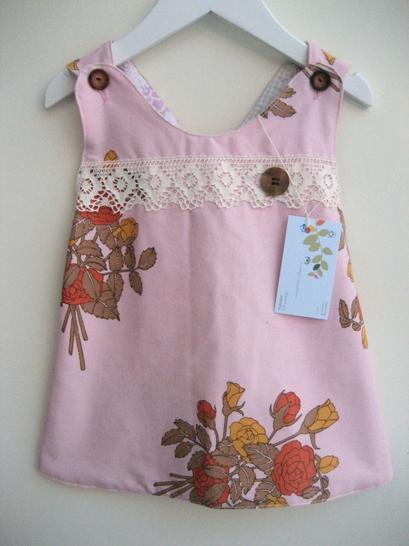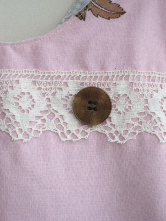 Skjønn forklekjole sydd i vintage rosa bomull med blomster, fòret med blomstret hvit bomull. Kjolen er pyntet med koselig blonde og knapper fra mormors knappesamling.