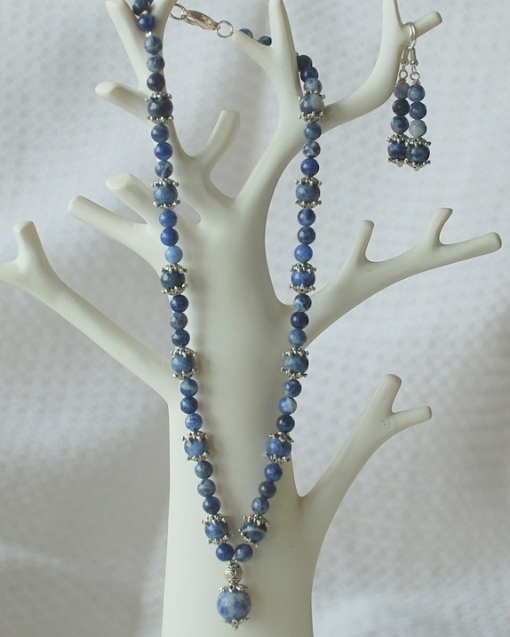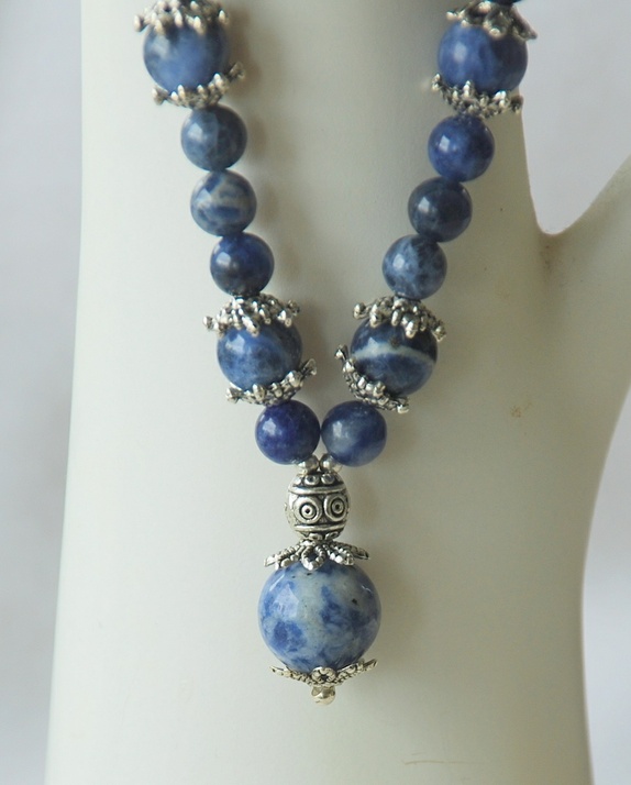 Sodalitt og tibetanske metallperler.44 cm Et smykke som passer like godt til fesklært som til dongri.Blåfargen kan variere litt fra lys blå til nesten mørk (vasket dongri).