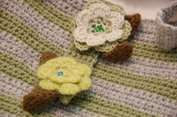 To hekleblomster i grønn-nyanser, med perlepynt, brukes som "lås". Disse er festet med sikerhetsnåler og kan enkelt taes av.