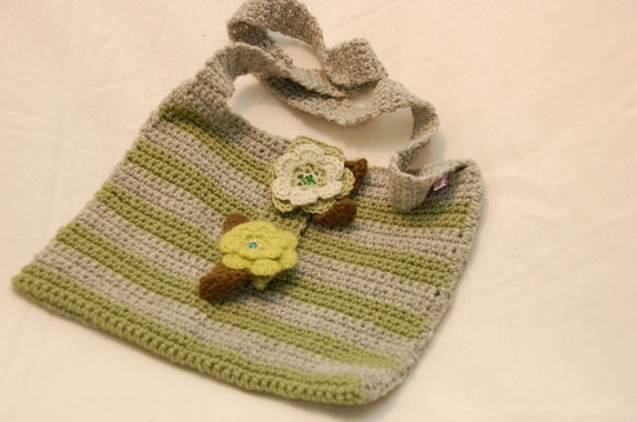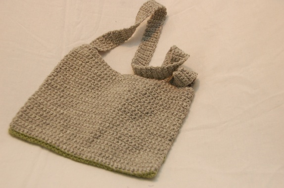 Vesken er heklet i striper av grått og grønt ullmixgarn. Bruken av fastmasker og en relativ liten heklenål gir et fast og godt resultat.