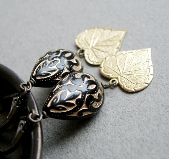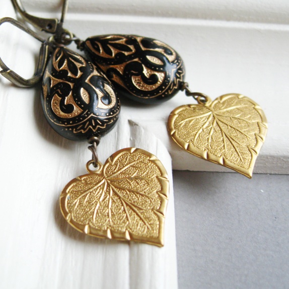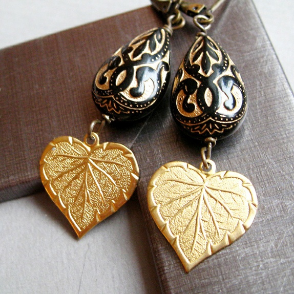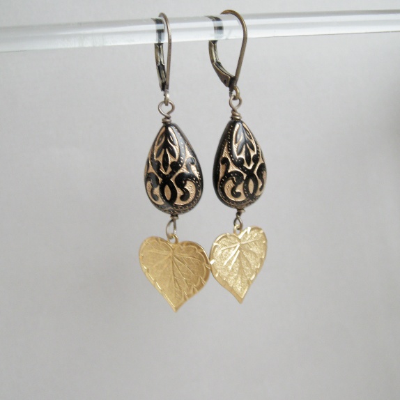 Festlige øredobber som er vintageinspirerte med svarte, dråpeformede perler av lucite med gravert gullfarget dekor. Nederst henger det hjerter, eller blader av messing. Metallet er messing. Nikkelfritt.