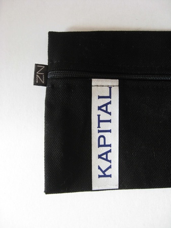 Svart pengepung sydd i kraftig bomullslerret med glidelåsåpning og trykk i hvitt og blått.