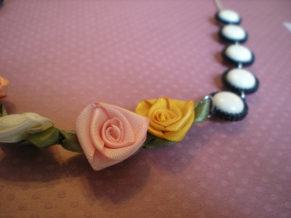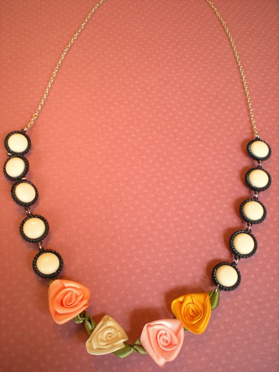 Dette halskjedet består av satengroser i vårlige, varme farger og sorte og kremhvite plastdeler. Veldig søtt på!