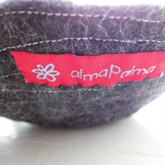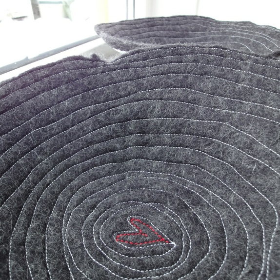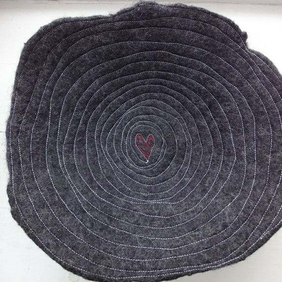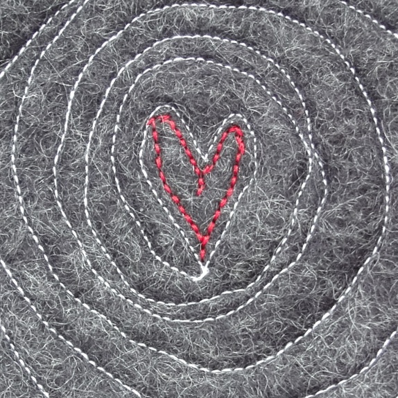 Tova skål i grå ull. Skåla har kvit maskinsaum-dekor, med eit raudt hjarte i botnen av skåla.