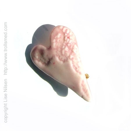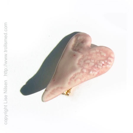Håndlaget hjerte, ca 2,2 cm. Laget for hånd og høybrent på 1260 grader.Messingfarget nål.