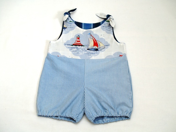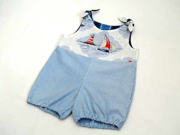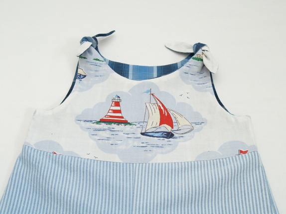 God og myk kortbukse med knyting over skuldrene. Buksa er sydd av en gardin med seilbåtmotiv og en herreskjorte med smale lyseblå og hvite striper. Overdelen er foret med en herreskjorte med store ruter i ulike blåfarger. To av materialene er i ren bomull, mens ett av dem er i en bomull- og polyesterblanding (60% / 40%).