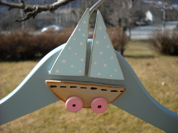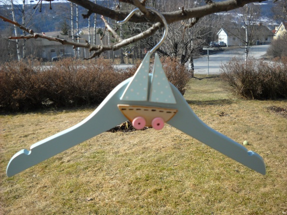 Barnekleshenger i støvgrønn (slags grønnblå) med håndmalt båt på.