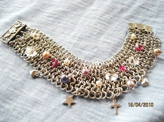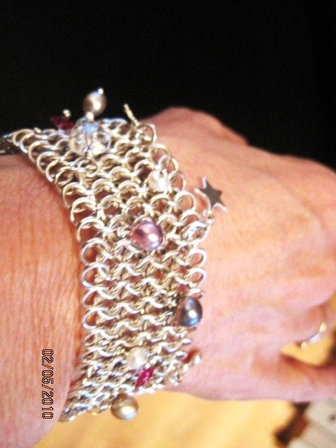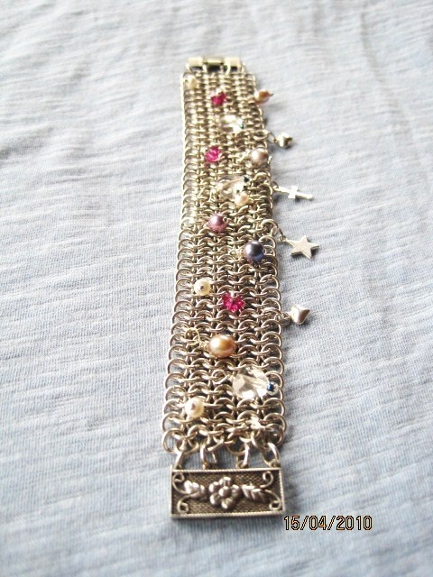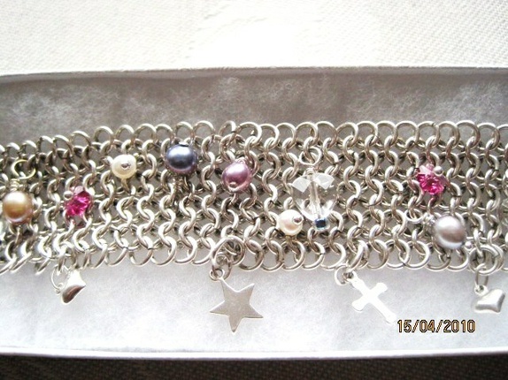 3 cm bredt armbånd satt sammen av sølvringer med charms av sølv og bergcrystal samt ferskvannsperler og swarovsky. Alle deler i ekte sølv