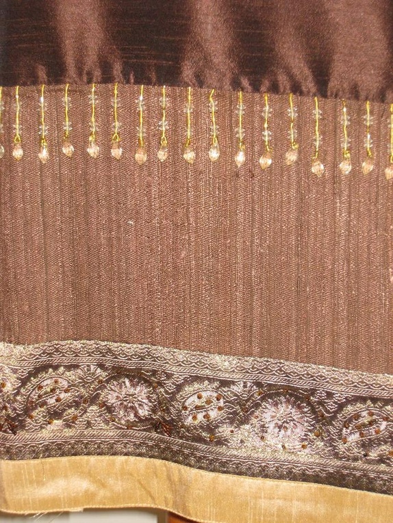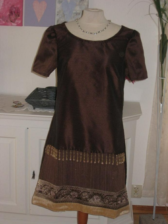 Hjelp med å spare miljøet vårt og kjøp redesignete klær.Kjole til både hverdag og fest !Mørk brun, med bånd og perler.