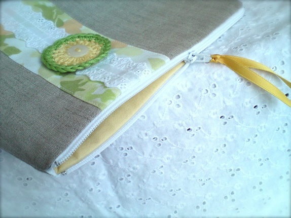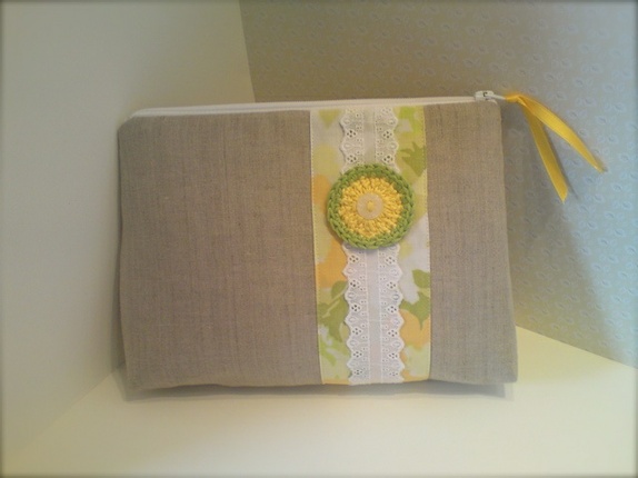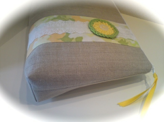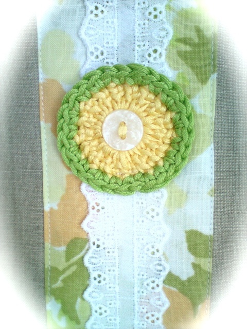 Jeg har brukt lin og gjenbrukstoffer, samt litt blonde. Jeg har også heklet en liten pynt som har fått en fin knapp med perlemorsglans.