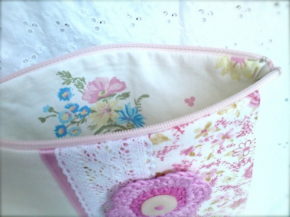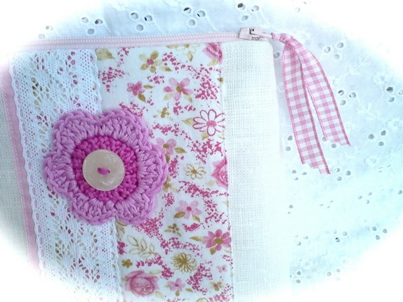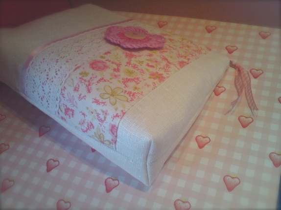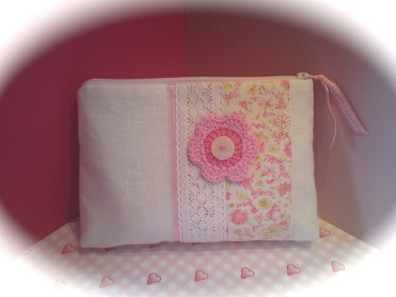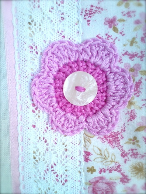 Jeg har brukt lin og gjenbrukstoffer, samt litt blonde. Jeg har også heklet en liten blomst som har fått en fin knapp med perlemorsglans.