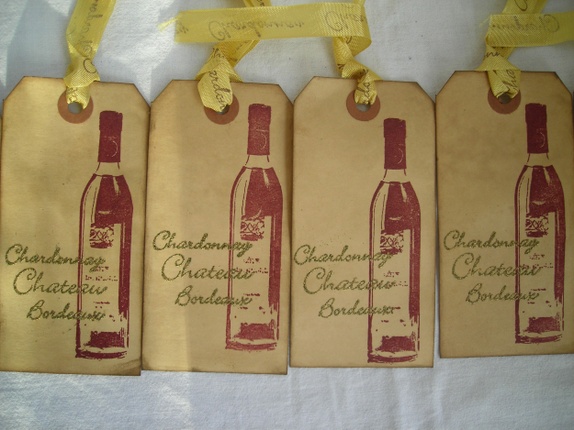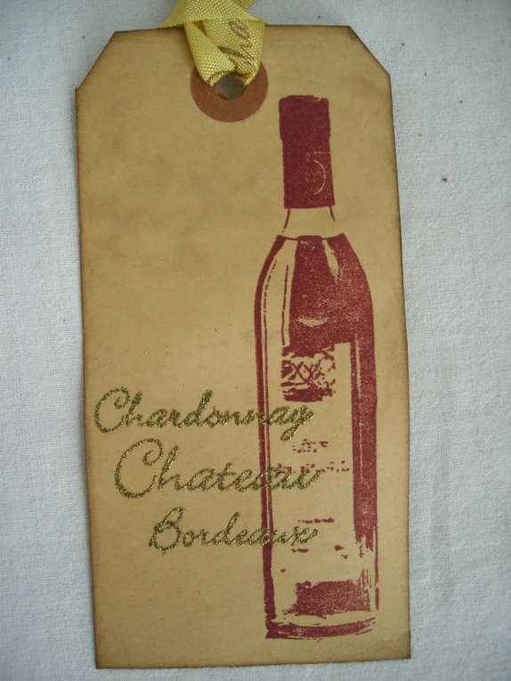 Lappene er dynket i kaffe og svertet i kantene for en "vintage look". Jeg har stemplet dem med en vinflaske i burgunderfarge og embosset "Chardonnay, Chateau, Bordeaux" i antikkgull. Gavelappene har gullfargede silkebånd påstemplet "Chardonnay".