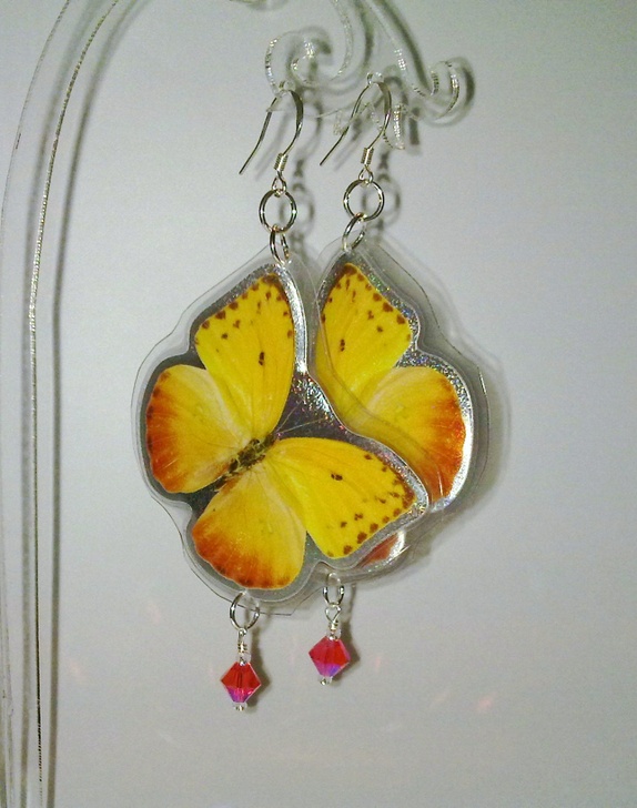 Store gule og orange laminerte sommerfugler. Rosa swarovski krystaller m dobbel AB i bunn. Ekte sølvkroker i ørene.Ca 8,5cm i lengde.