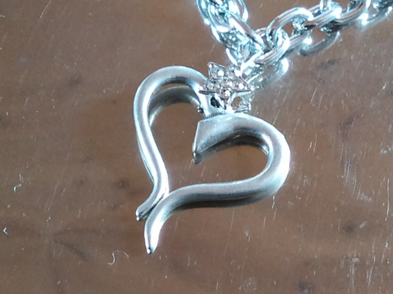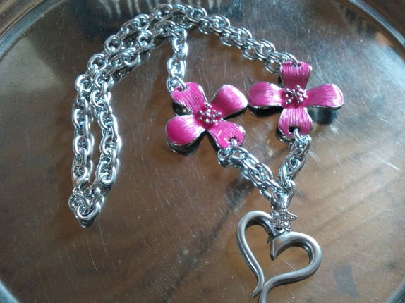 Halskjede laget av litt grov lenke og blomster, med hjerteanheng.