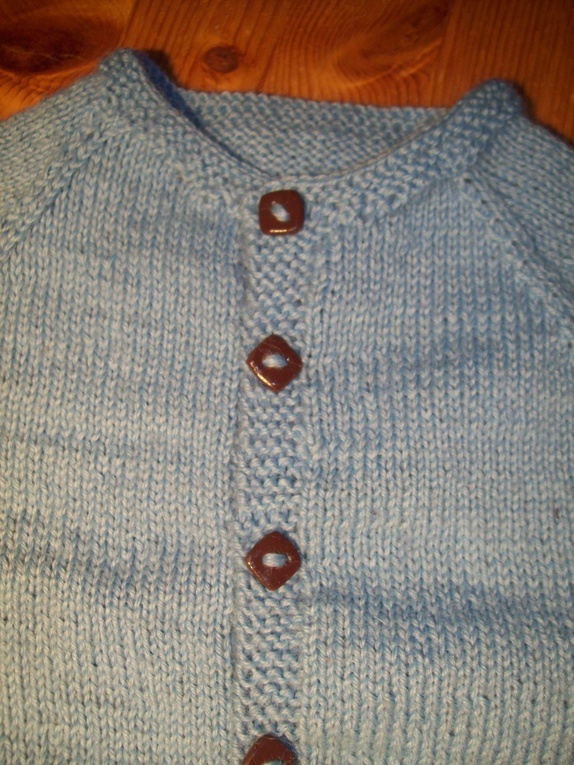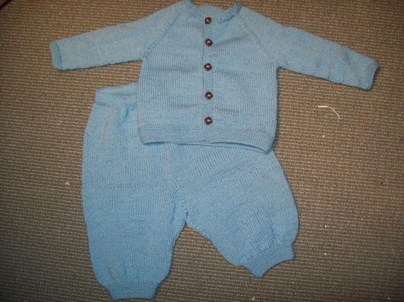 Nydelig hentesett til guttebaby, størrelse 0-3 mnd. Strikket i myk babyull med hjemmelagede knapper i.