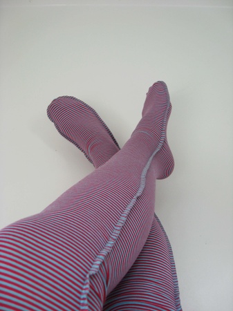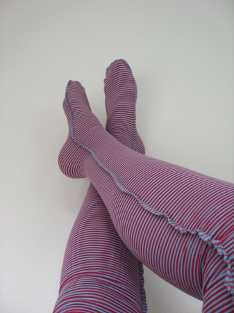 Lange, deilige knestrømper som rekker godt over knærne. De er sydd i turkis og rosa, smalstripete bomullsjersey. Knestrømpene er fasongsydd med en dekorativ overlocksøm på utsiden. De finnes i 2 størrelser: 36-38 og 39-41.