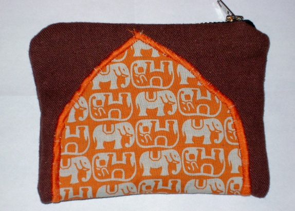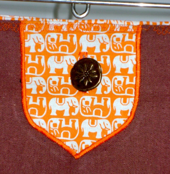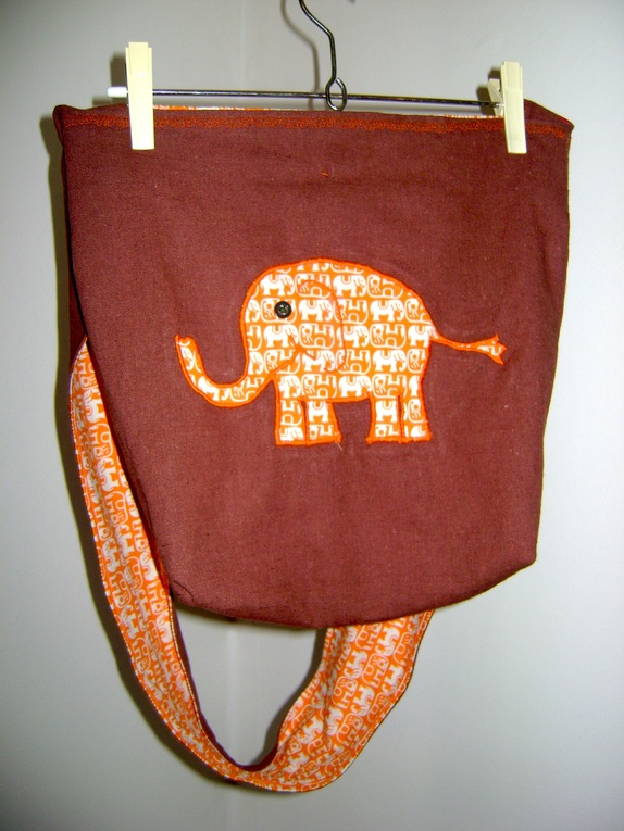 Veske i brun lin fora med bomullstoff med små elefantar på.