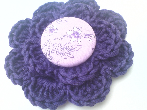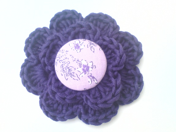 Heklet i lilla bomullsgarn med knapp trukket i stoff - lavendelfarget bunn med små lilla blomster.