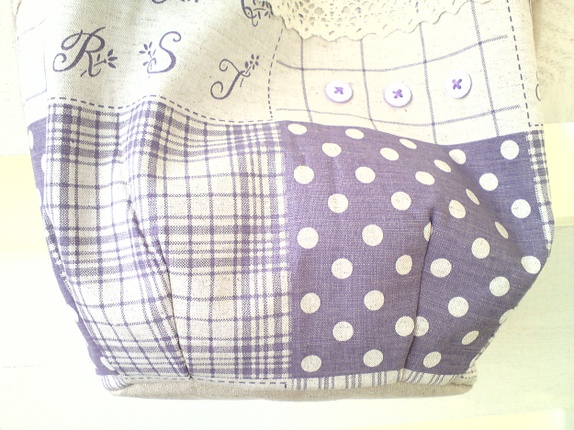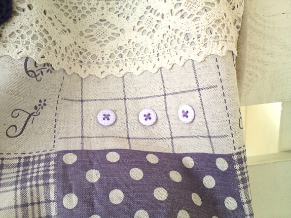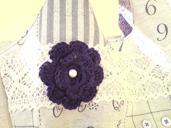 Pyntet med heklet blonde og knapper. Heklet blomst med knapp i perlemor.