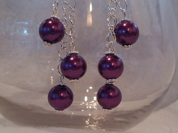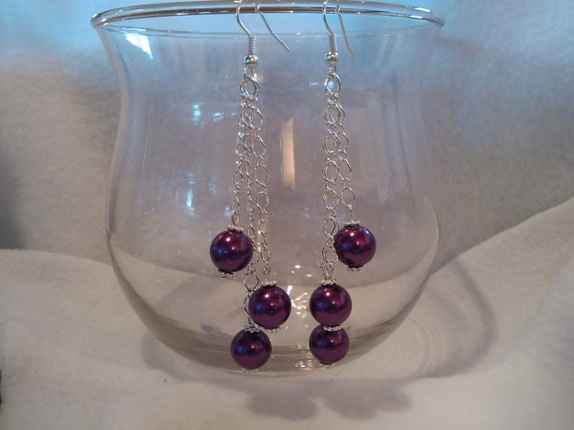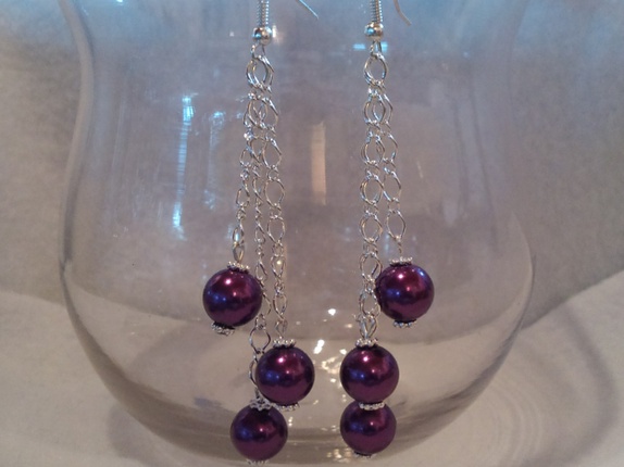 Lang ørepynt med lilla glassperler og metall-lenke.