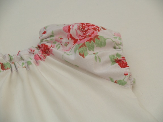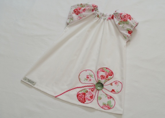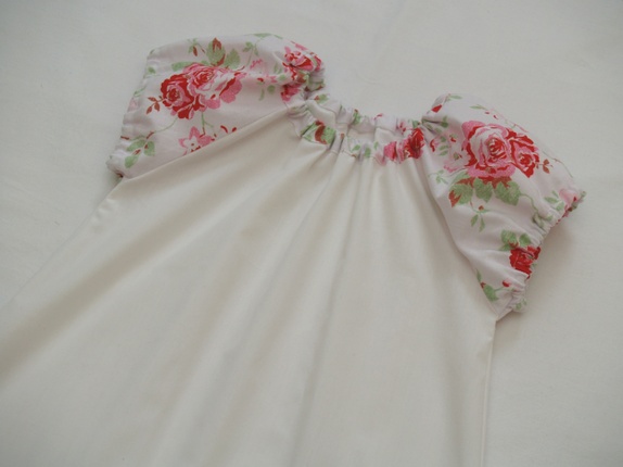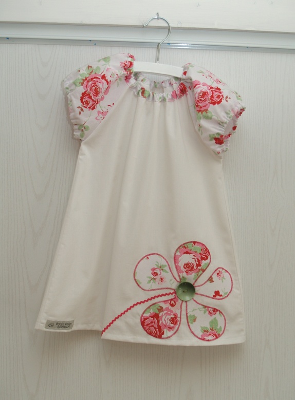 Romantisk rynkekjole med puffermer. Selve kjolen er sydd av en hvit herreskjorte. Ermene er fra en stoffrest kjøpt på loppemarked, med roser i rødt og rosa og lysegrønne blader på hvit bunn. Kjolen er pyntet med en stor, applikert blomst i samme stoff som ermene, med en stor, grønn knapp i midten av blomsten. Knappen er sydd veeeldig godt fast. Strikk i hals og armer.