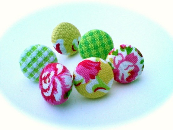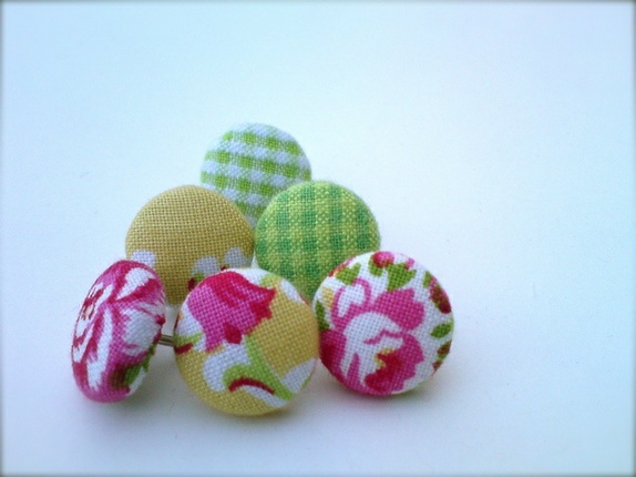 Trukket i stoff i gult og grønt. Nålene er solide.