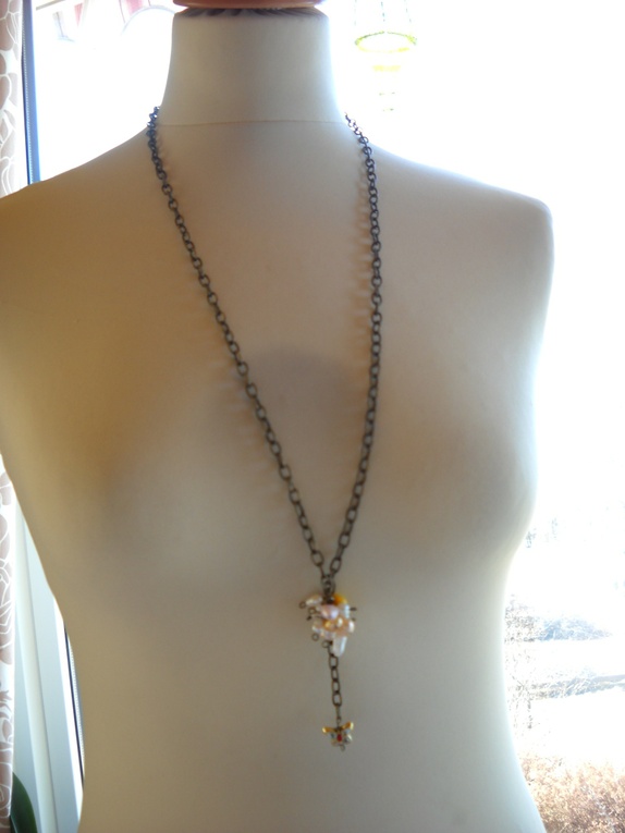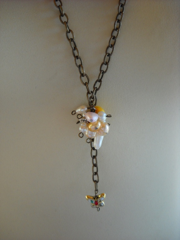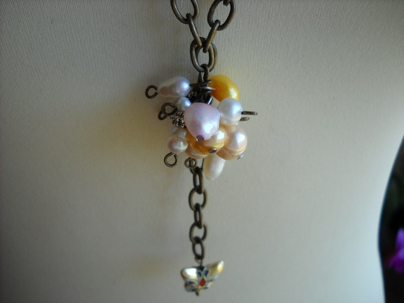Langt kjede i "bronse" med anheng av ferskvannsperler og sommerfugl.
