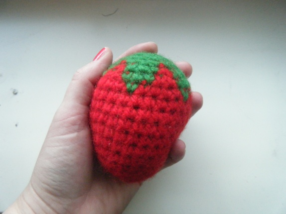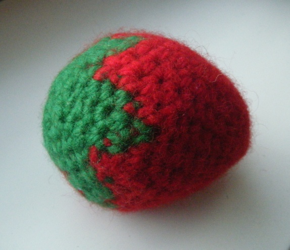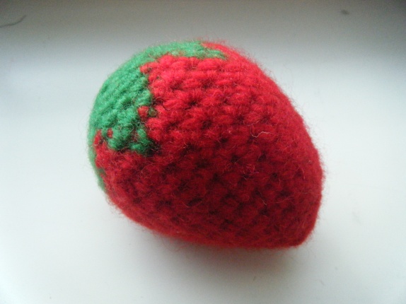 Dette er en tovet babyrangle formet som et jordbær. Den er laget i fritidsgarn, fyllt med fleece og så vasket på kokvask. Dermed tåler den å bli vasket mange ganger senere :)