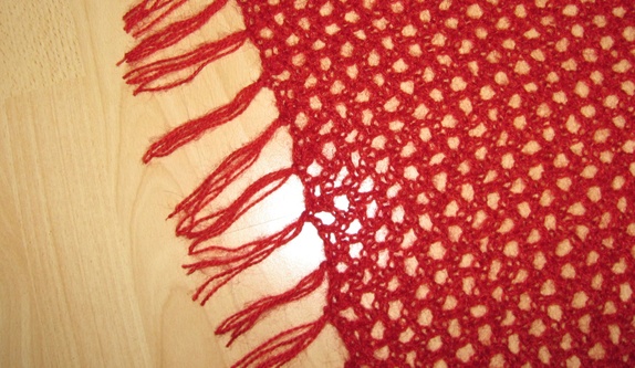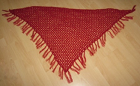 Rødt, heklet sjal, ca 120 cm over skuldrene, 70 cm fra topp til spiss. Mohairgarn. Deilig på kjølige kvelder!