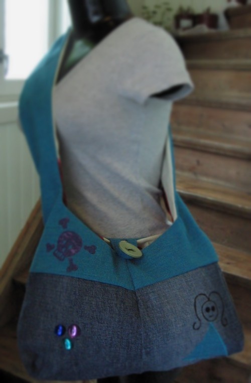 Veske i jeansstoff og turkis bomull. Redesign av en jeansbukse og en gardin. Fôret med bomullstoff med røde hjerter. Knappelukking og lomme på innsiden.