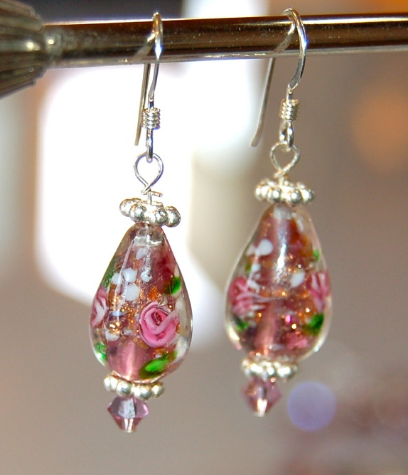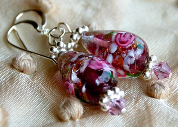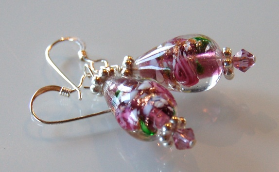 Vakker ørepynt i 925ss, Swarovskikrystaller og nydelige burgunder glassperler.