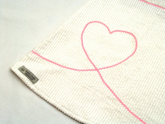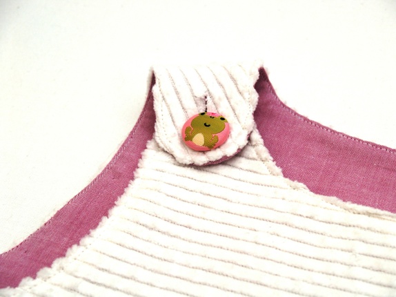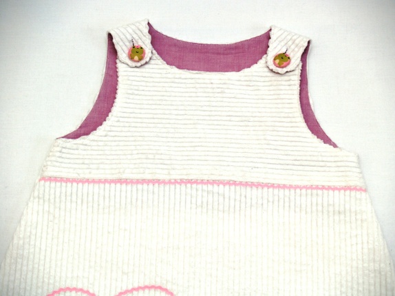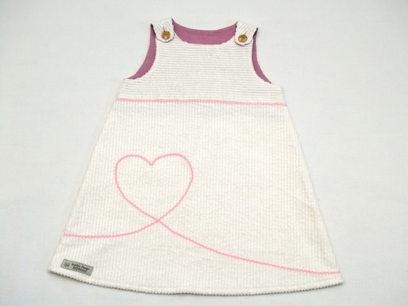 Søt, slitesterk kjole som tåler røff bruk :) Sydd av et kraftig, hvitt cordfløyelsstoff. Pyntet med en lyserosa kroklisse som slynger seg som et hjerte over hele kjolens underdel. Overdelen er foret med tynt, gammelrosa bomullsstoff. Søte, stofftrukne knapper.