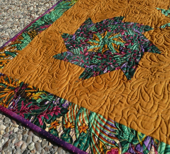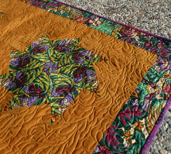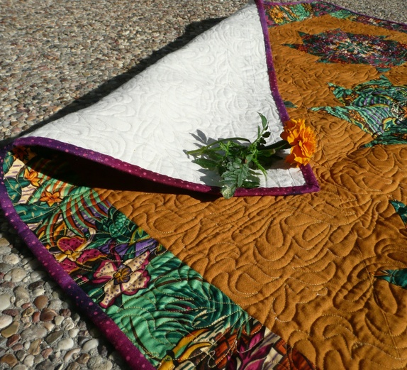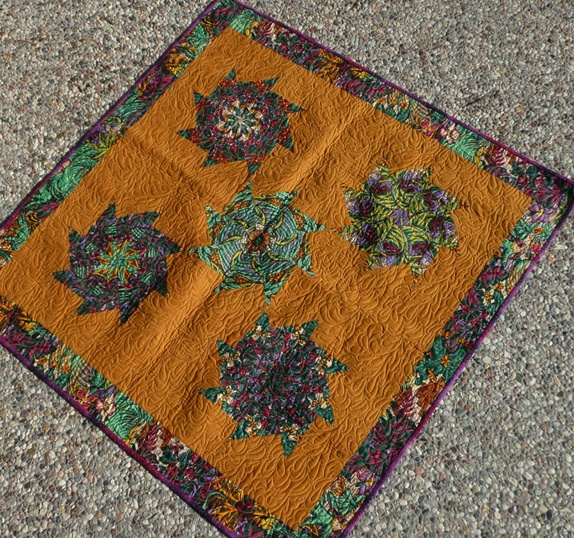 Veggquilt i flotte farger. Måler 91,5cm x 91,5cm. Maskinquiltet på førsteklasses stoff, kanten er sydd ned for hånd. Flott tett quiltdesign på denne.