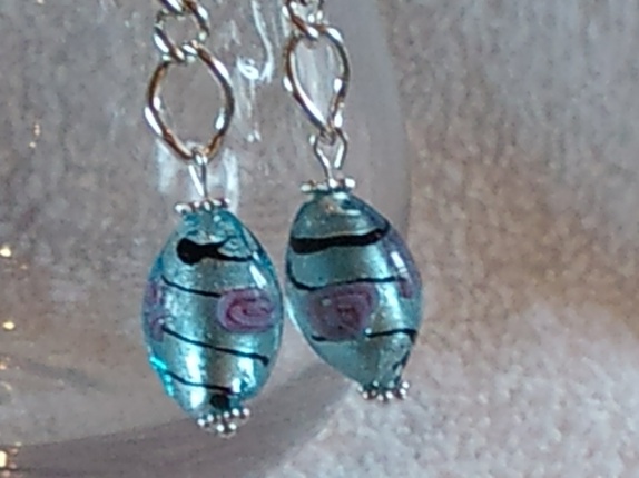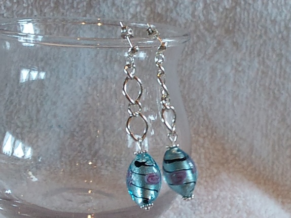 Øredobber laget av lenke og blå glassperler med roser inni