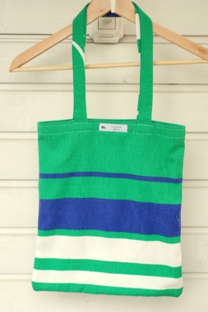 Bærenett i grønn, blå og hvit sydd av en gammel duk. Duken er vasket før den er sydd i. Kan ha spor etter tidligere liv. Sømmene er lukket med fransk søm, slik at det lettere tåler slitasje. Lange hanker, så man får de over skulderen.