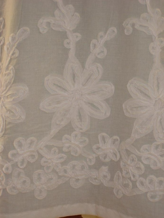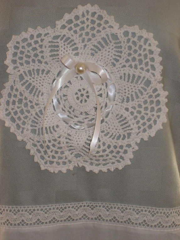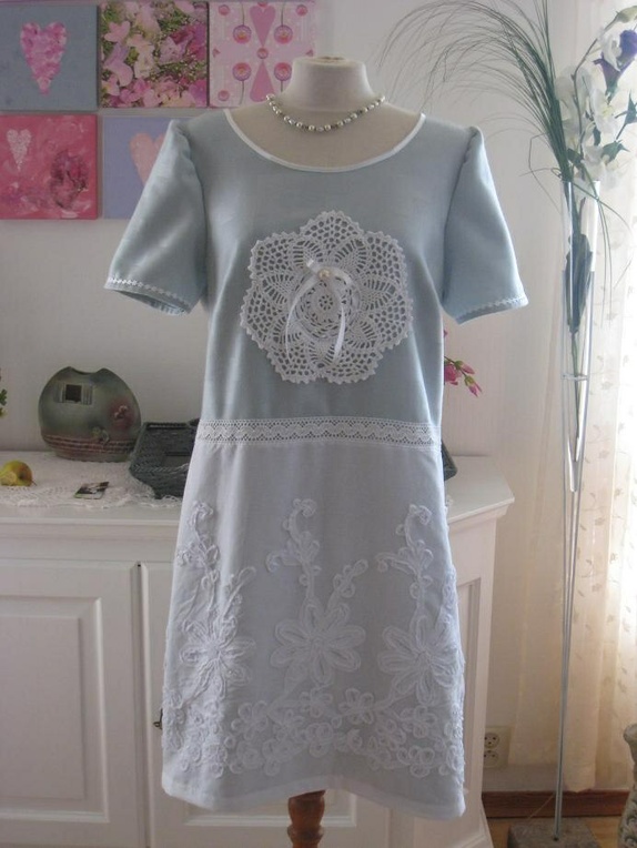 Nydelig kjole til sommeren i duse fareger.Kjolen er llys blå med hvite detaljer som blonder, bånd, hekleverk og perle.Glidelås i ryggen.