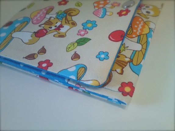 Laget i japansk bomull foret med turkis bomull med hvite prikker. Lukkes med trykknapp.