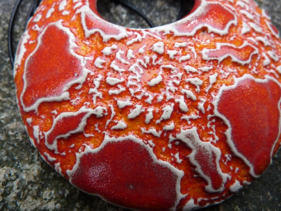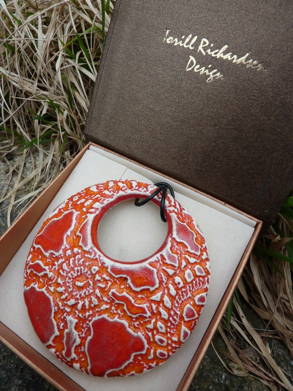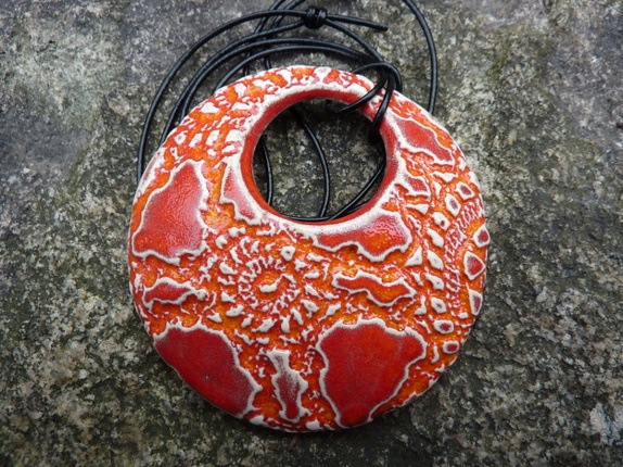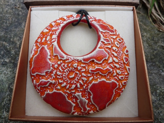 Halssmykke er laget av leirgods og har en diameter på 6.8 cm.Et pent rødt smykke med nyanser i orange og hvitt.Sort lærsnor med regulerbar knute.Flott gaveeske følger med.Dette smykke er min favoritt.