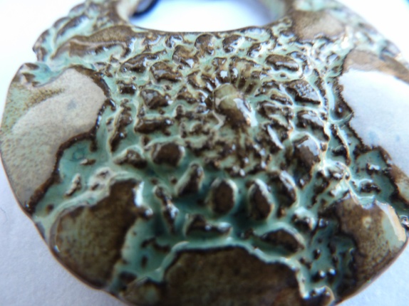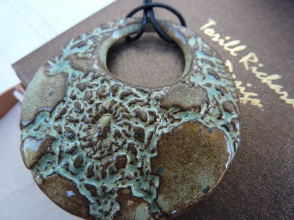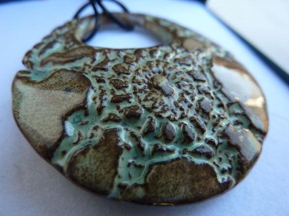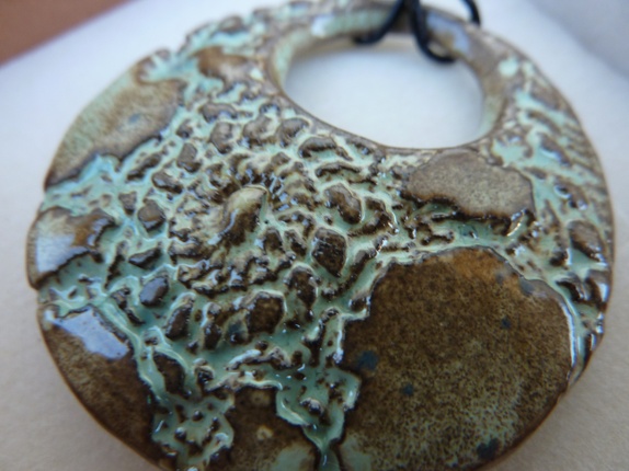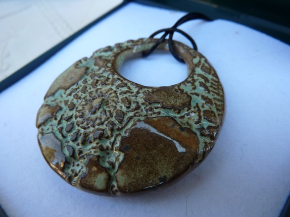Halssmykke er laget av leirgods, sortleire.Diameter 4,5 cm.De forskjellige fargenyansene gjør at smykket gir et levende utseende.Sort lærsnor med regulerbar knute.Smykkeeske følger med.