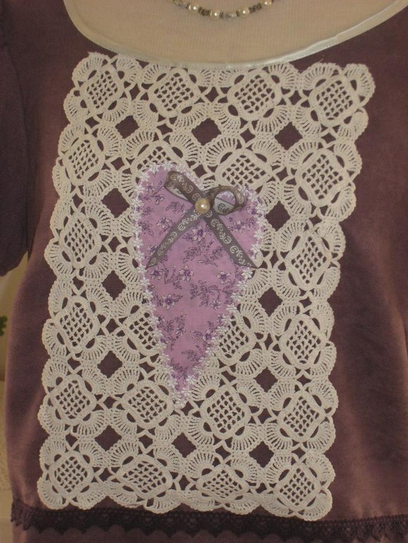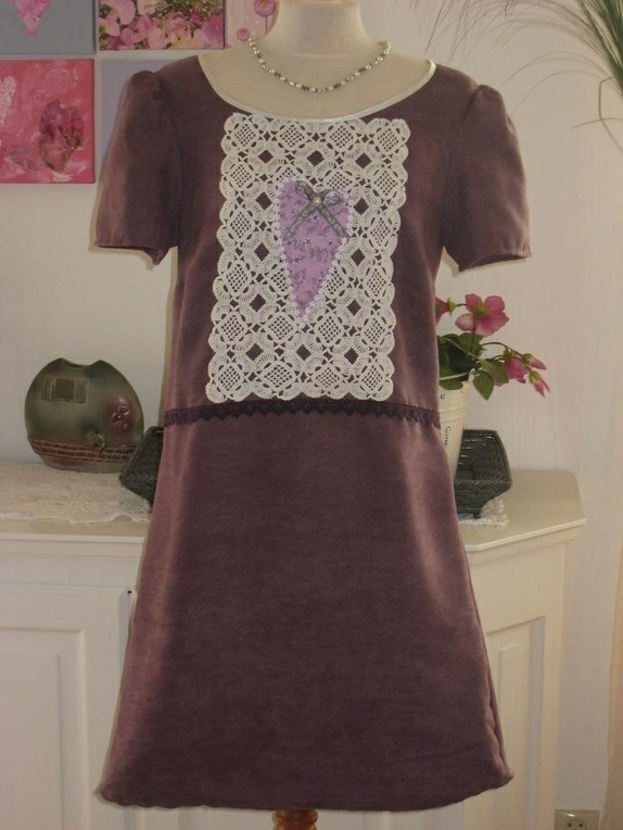 Kjole sydd i stoff som ser ut som "semsket" på utsiden, og "silke" for innvendig.Pyntet med hekleverk, bånd og perle. Applikasjon bak på kjolen.