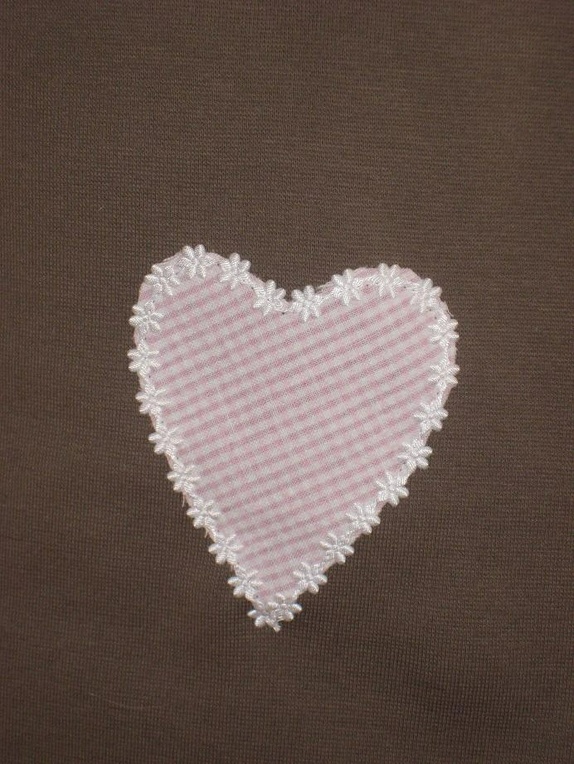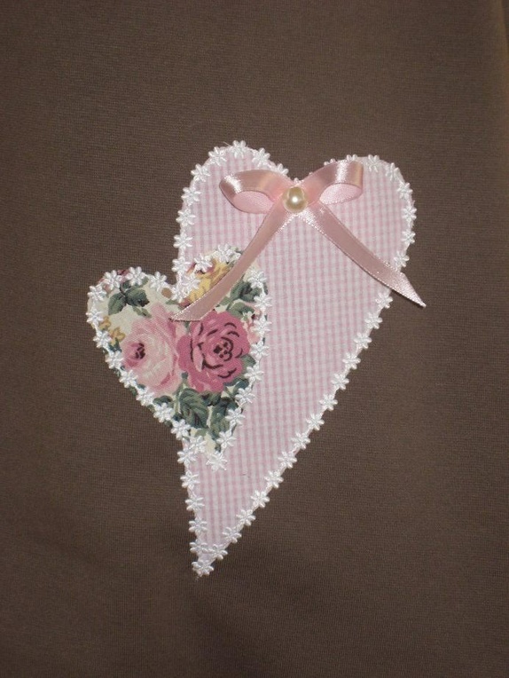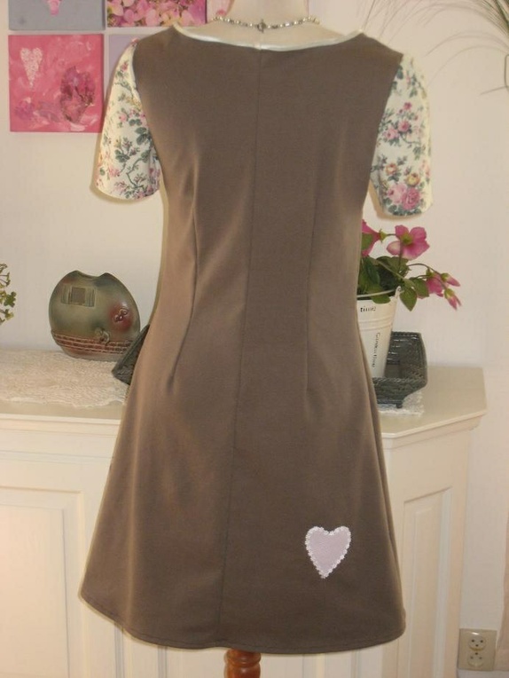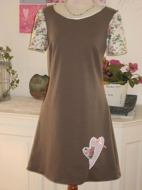 Brun og rosa jerseykjole med applikasjoner, bånd og perle.