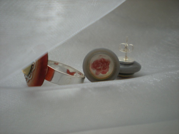 Lysegrå øredobber med rosedekor i en rød rustfarge.