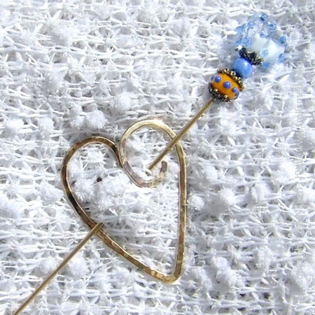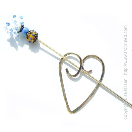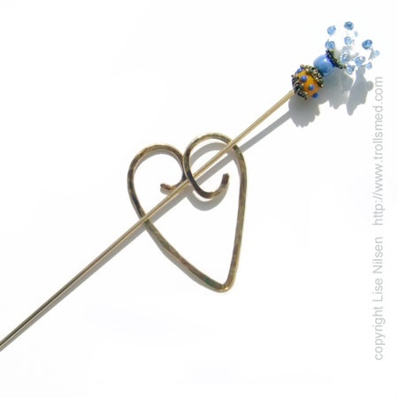 Sjalnål av bronse, med lampwork. Blått hjerte
