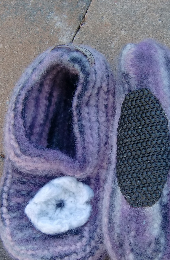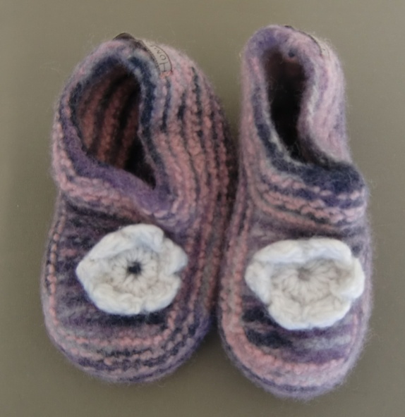 Tova tøfler i lilla med rosa striper og hvit blomst.Tøflene har "såle" slik at de ikke er glatte.Utrolig gode og varme.Ca str 30-34