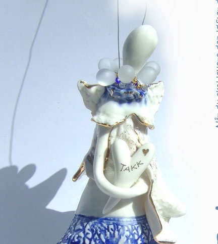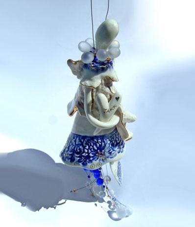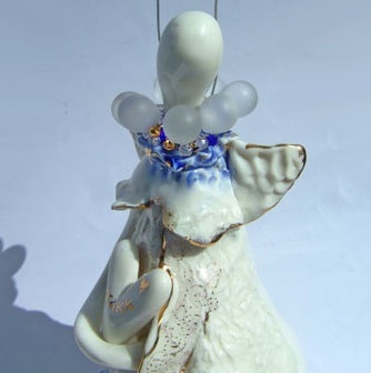 Håndlaget porselensengel med glasskrystaller og glassperler med ekte gull i. Dekorert med fastbrent gull.