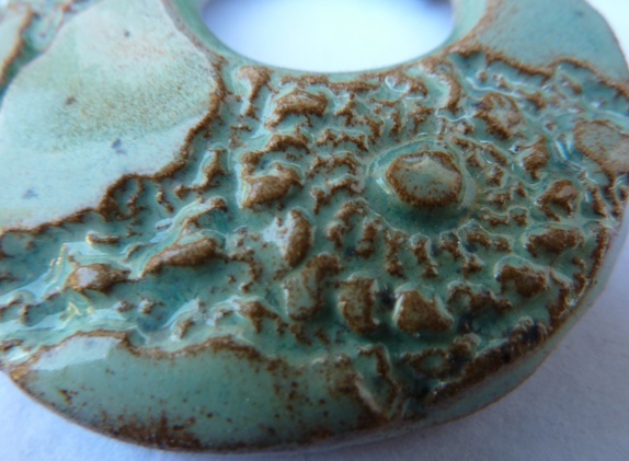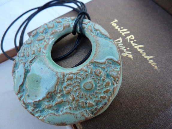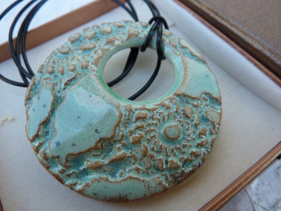 Halssmykke er laget av leirgods og har en diameter på 5 cm.Mintgrønn glasur på lys brun leire.Sort lærsnor med regulerbar knute.Smykke eske følger med.
