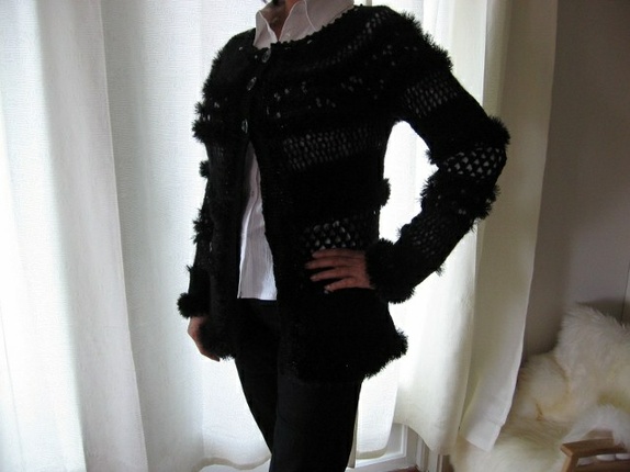 Denne svarte jakken er strikket og heklet i forskjellige garntyper og teknikker. Knappelukking Størrelse 38/40. Overvidde: 88 cm, hel lengde: 60 cm, armlengde: 53 cm